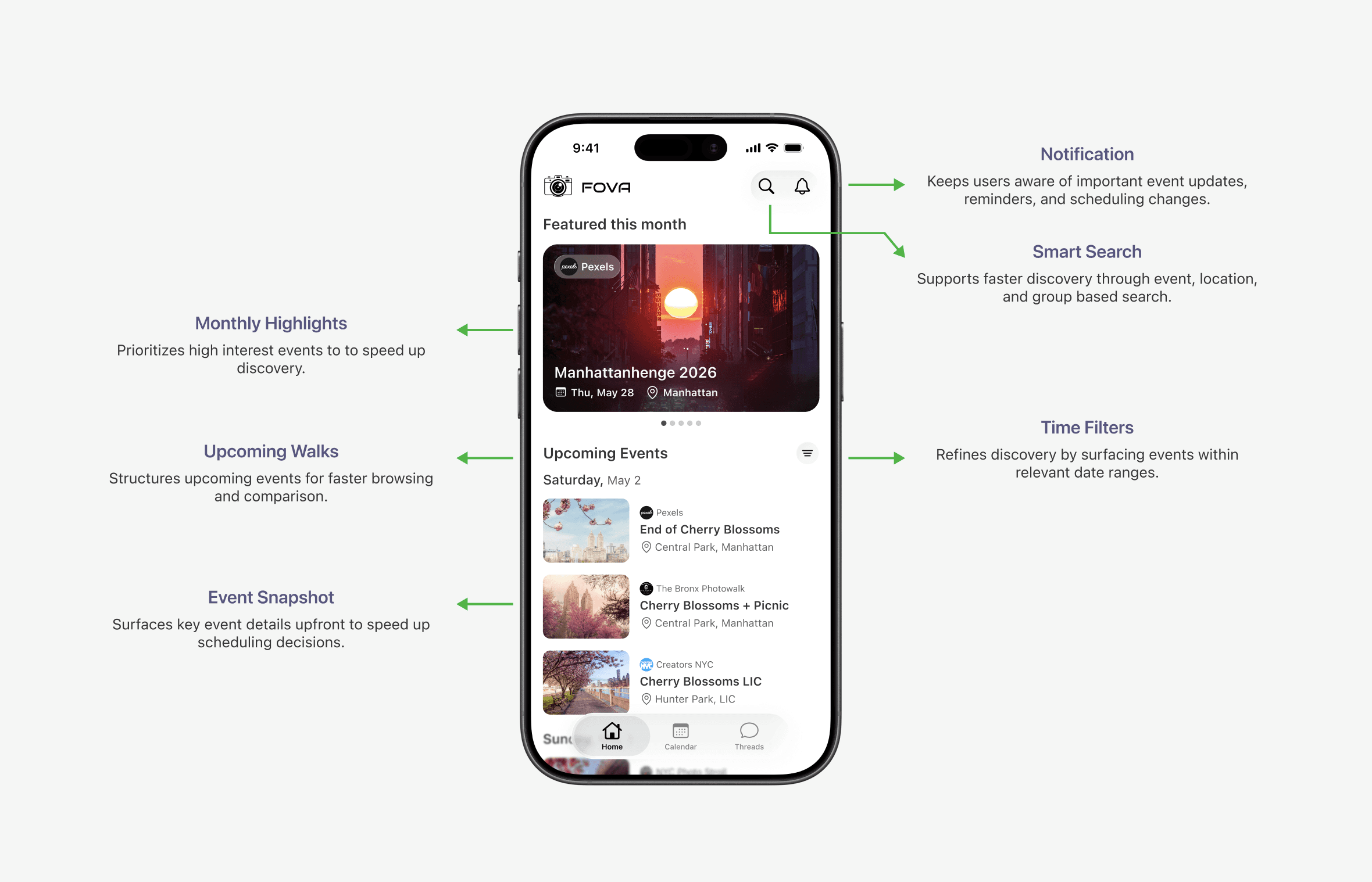 Fova replaced a fragmented ecosystem of Meetup, Instagram and WhatsApp with a unified platform for hosting, scheduling, tracking and communicating NYC photowalk events.