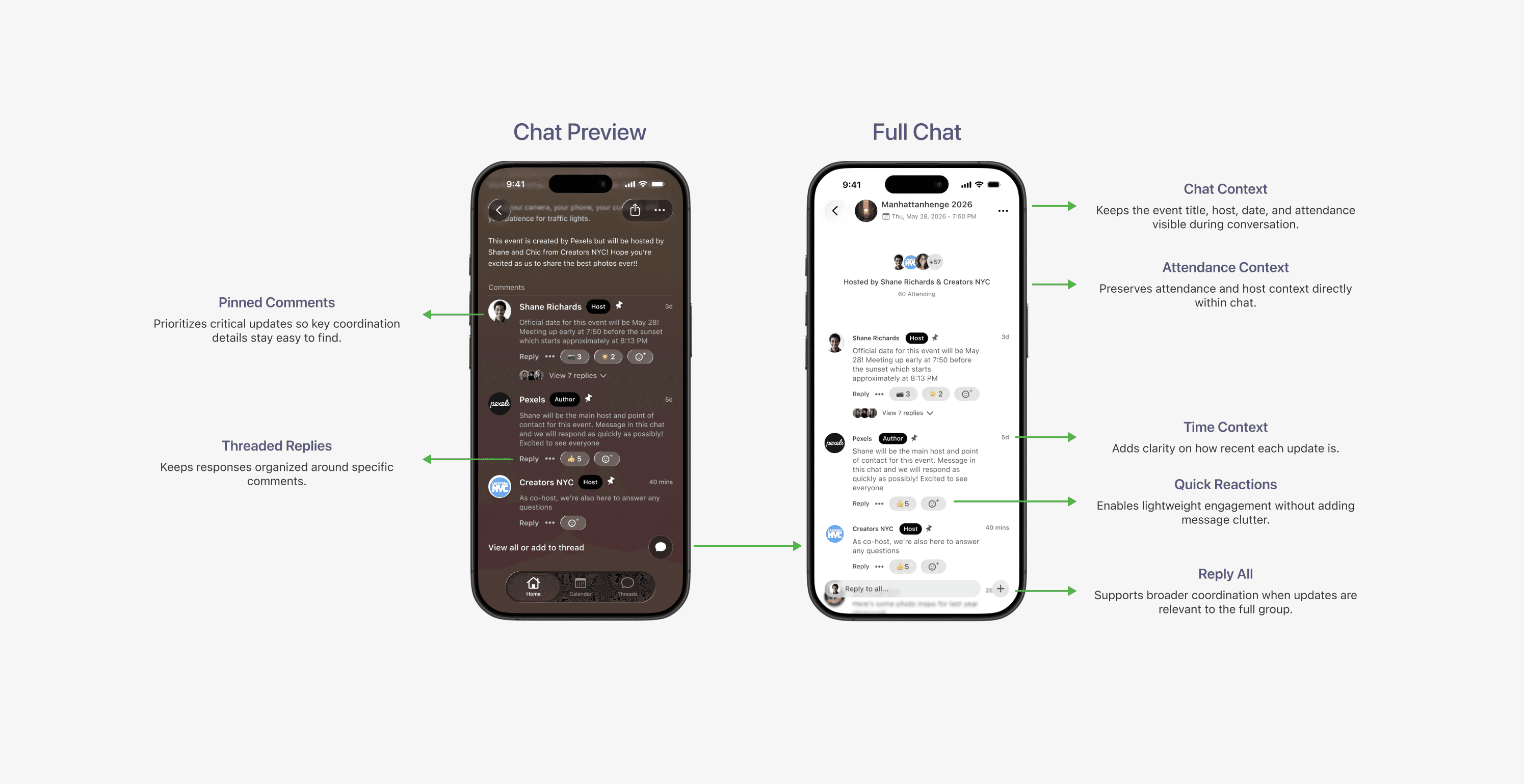 Reduced missed updates by aligning communication to the event lifecycle instead of forcing users to scan fragmented chat threads.